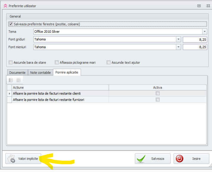 Ne logam cu userul respectiv pe cocietatea respectiva, mergem in Configurari>preferinte Utilizator>Valori implicite,