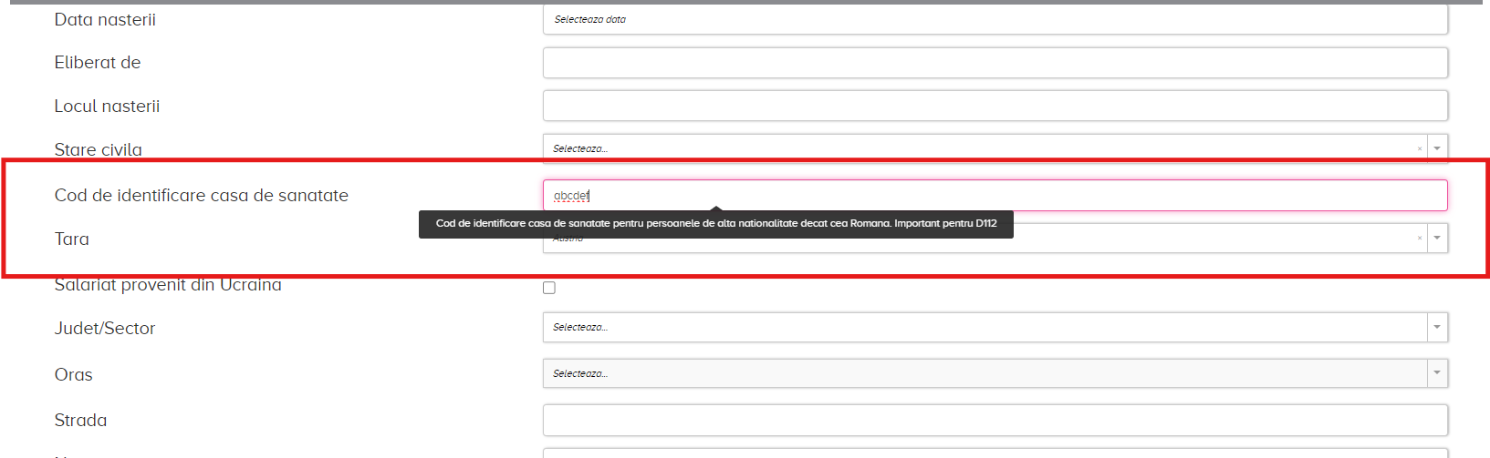 Campul acesta este doar pentru cei cu alta nationalitate. Daca este roman, ii stergi acest camp si setezi din nou tara Romania.