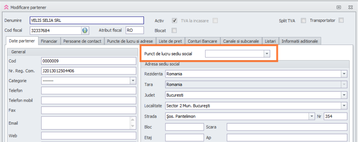 Trebuie sa verifici partenerul, pe tabul de puncte de lucru si adrese trebuie sa aiba un punct de lucru cu bifa de sediu social. Daca nu are si nu poti sa pui, pe tabul general ii schimbi punctul de lucru cu oricare altul si salvezi. Intri din nou pe partener, pui punctul de lucru corect si salvezi, asa se va pune automat bifa de sediu social.