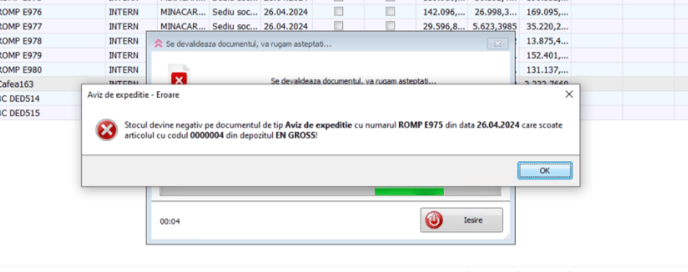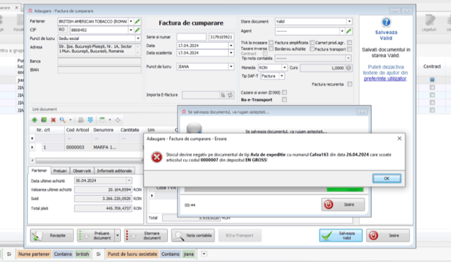 Clienta primeste eroare pe un aviz de expeditie la validarea unei FC: