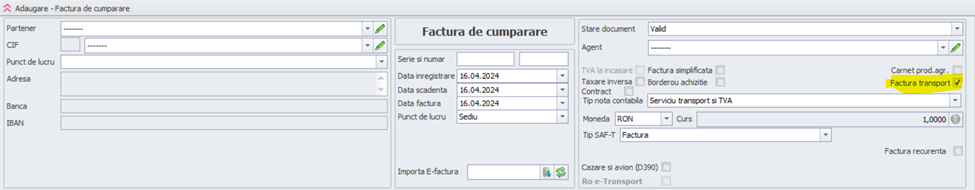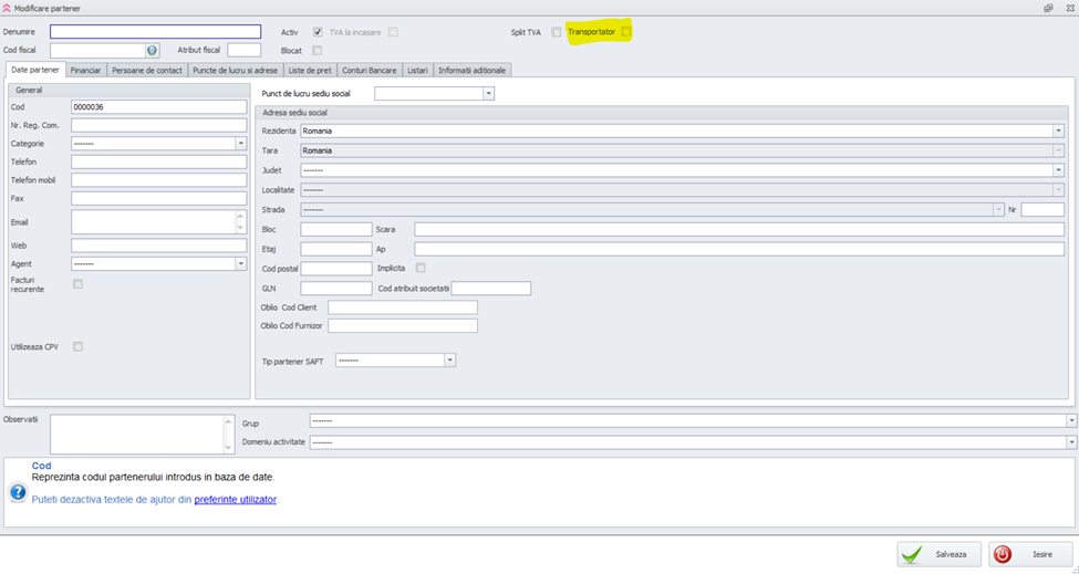 - Trebuie sa aveti creat transportatorul in Nomenclatoare -> Parteneri -> Parteneri, si acesta sa aiba bifa de Transportator aplicata astfel: