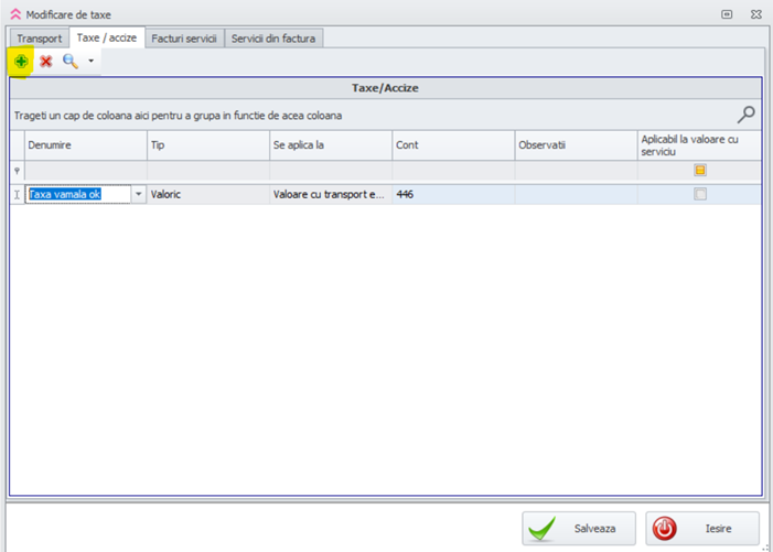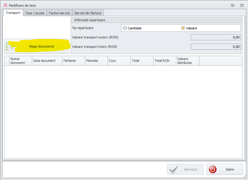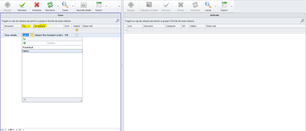 Taxa poate fi configurata fie Procentual, fie Valoric, aplicandu-se fie la Valoare cu transport extern sau Valoare fara transport extern, si apoi sa alegeti si contul.