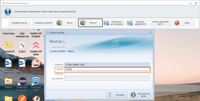 Mai departe parola se completeaza la client si se merge pe Salveaza si ulterior se apasa *Server* , apoi se completeaza datele in campurile Licenta: si CUI/CNP si se apasa Activeaza.