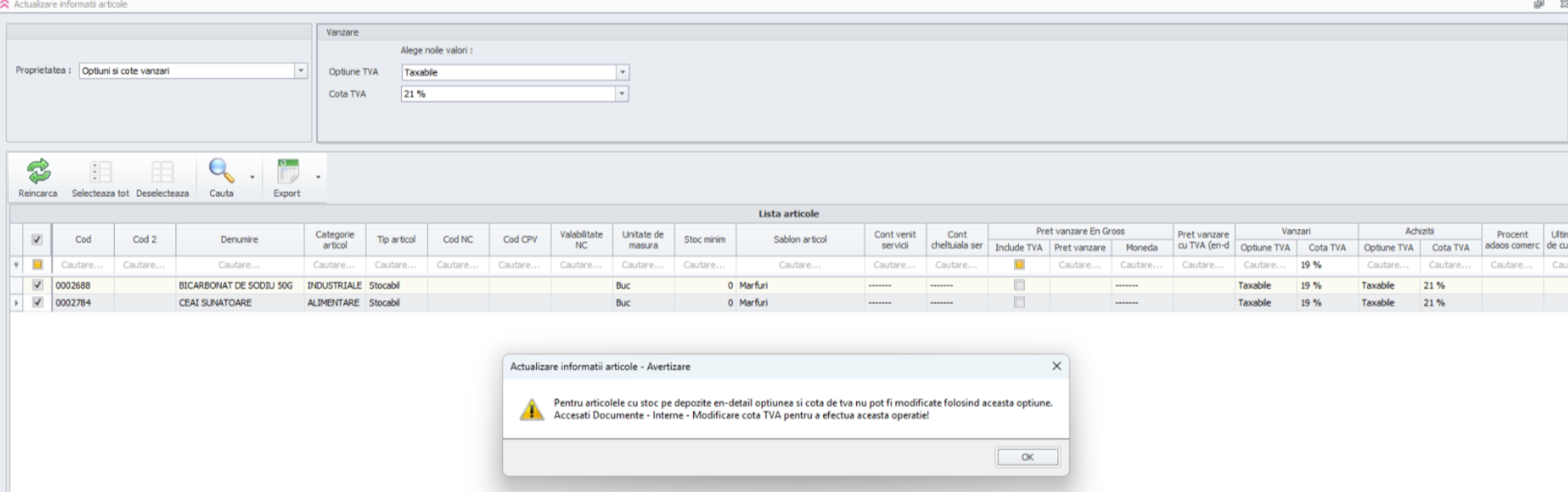 iar daca incerc prin documentul modificare cota tva, nu imi mai gaseste niciun articol.