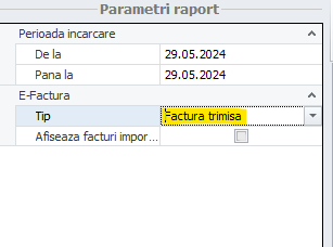 Si la filtrare raport, se selecteaza la tip Factura, Facturi trimisa
