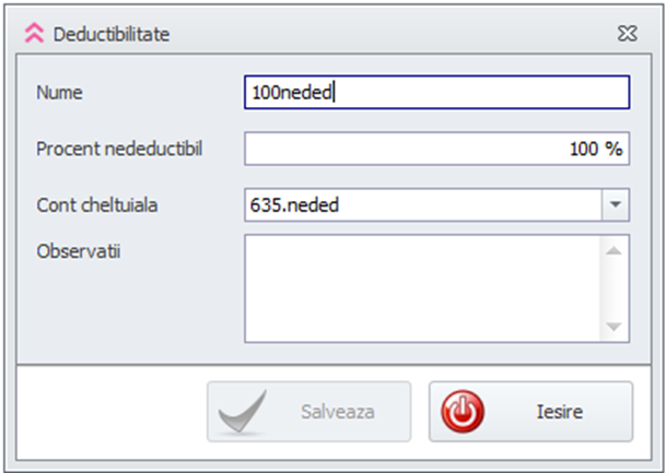 1. Se creeaza un element de tip “Deductibilitate” cu “Procent nedeductibil” 100% si se alege contul de cheltuiala folosit la nota de ajustare.