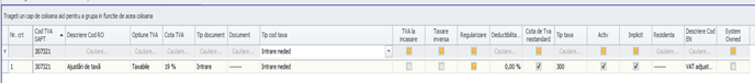 In cazul codului 307321 “Ajustari de taxa”, pentru a fi preluat pe nota de ajustare a deductibilitatii TVA, configurarea se face in urmatorul fel: