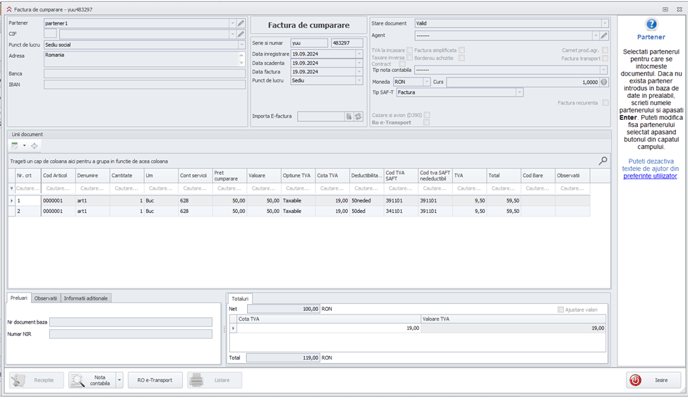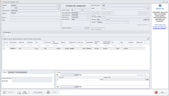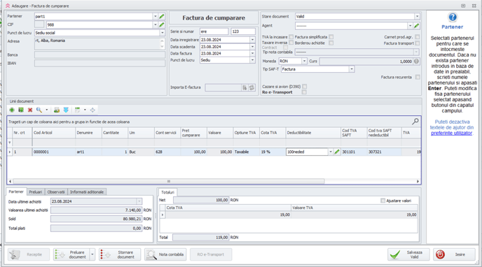 3. Se inregistreaza o factura de cumparare si se selecteaza pe coloana “Deductibilitate” elementul creat in prealabil.