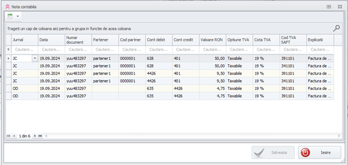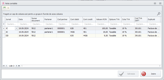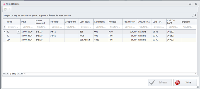 Nota contabila generata arata in felul urmator:
