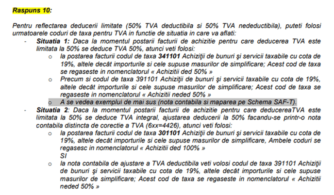 Avem astfel inregistrarea notei si a codurilor pentru SAFT, conform cu raspunsul furnizat de ANAF in ceea ce priveste achizitiile cu TVA 100% nedeductibil.