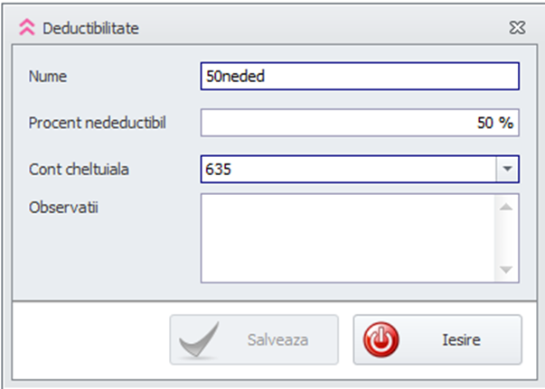 Daca se doreste inregistrarea conform situatiei 1, se vor crea 2 elemente de tip deductibilitate, unul pentru 50% deductibil si unul pentru 50% nedeductibil.