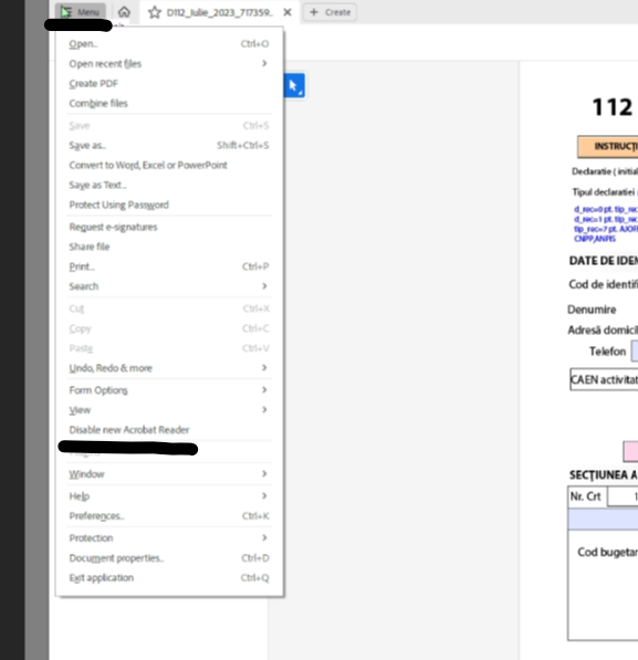 Cum se importa XML 112 daca are formatul nou de Adobe? Cum se importa XML 112 daca are formatul nou de Adobe? Se merge sus in stanga pe cele 3 liniute de la Menu apoi Desable New Acrobat Reader