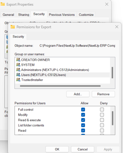 Aici vom crea un folder cu numele de Export cu drepturi full.